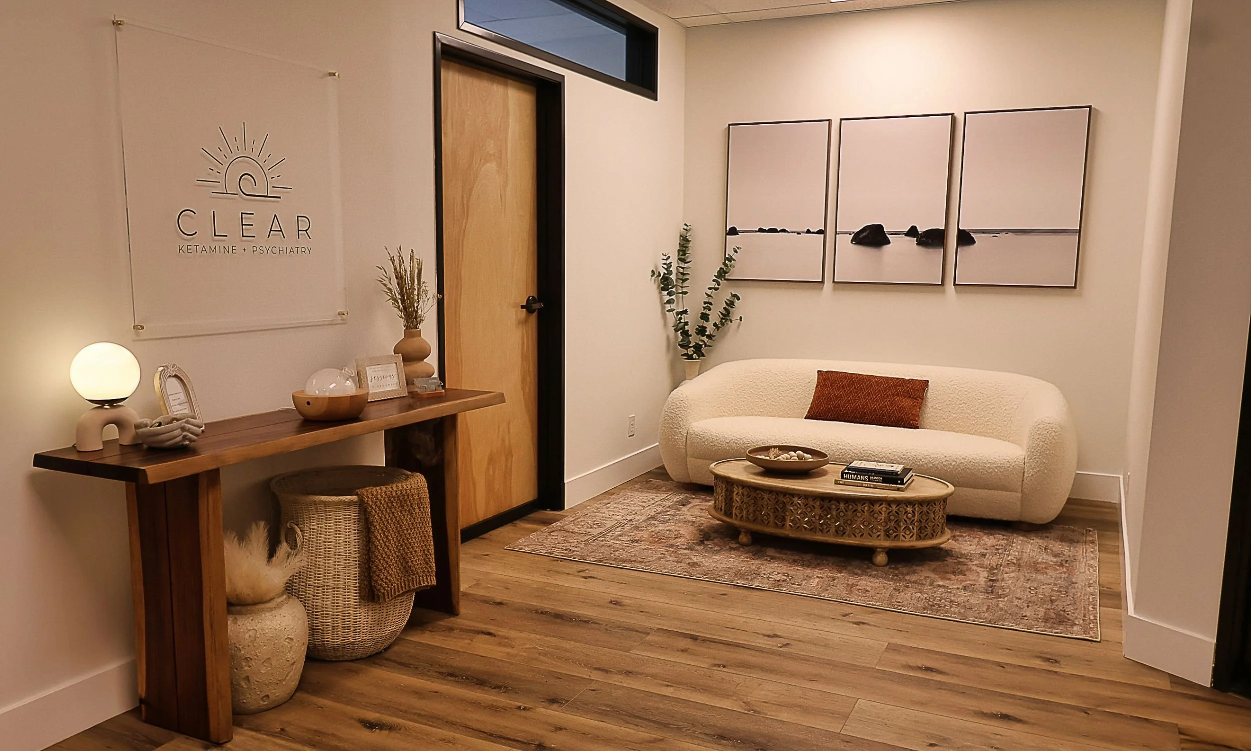 The welcoming waiting area at CLEAR Ketamine + Psychiatry, where patients begin their journey from hopelessness to renewed possibility.